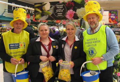 Marie Curie Cancer Care Great Daffodil Appeal is a nationwide fundraising event for cancer care. Standing outside Tesco’s, your local Lions Club members raised many hundreds of pounds for this Cancer Care organisation. Employing many nurses, doctors and other healthcare professionals, they will provide care for people with cancer but also care for people with other life limiting illnesses. The charity is best known for its Network of Marie Curie Nurses working in the community to provide end of life care for patients in their own homes. Most of their income comes from the generous support of thousands of individuals like Tesco’s customers, organisations and businesses, with the balance of funds coming from the NHS. They also depend on an army of volunteers to support their work in both care and fundraising which is where your local Lions Club helped. Last weekend, Lions collected at Tesco’s Supermarket, who supported the event and our grateful thanks are extended for your donations amounting to £855.