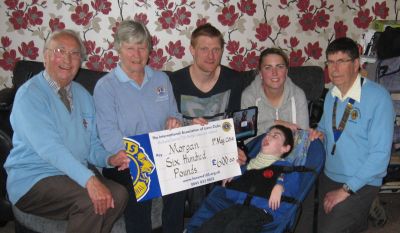 Photo: Lion members Welfare Chairman Russell Ford, Lion Trish Rouse and Lion President Trevor Hipwood with Morgan and his mum & Dad, Charlotte, Leon holding the cheque.Charter Lunch, Sun 6 April 2014