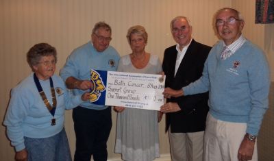 Photo: Lion President Margaret Small, Lion Derek Yelling, Vivienne Derrick, John Carter, Chairman of Bath Cancer Unit Support Group and Lion Geoff Moore with the cheque.4th July 2014: Handover