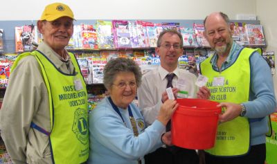 Photo: L-R Lion Alan Denham, organiser, Lion President Margaret Small, Store Manager Dave Meagor selecting the winning tickets and Lion Derek Livsey, fundraiser.